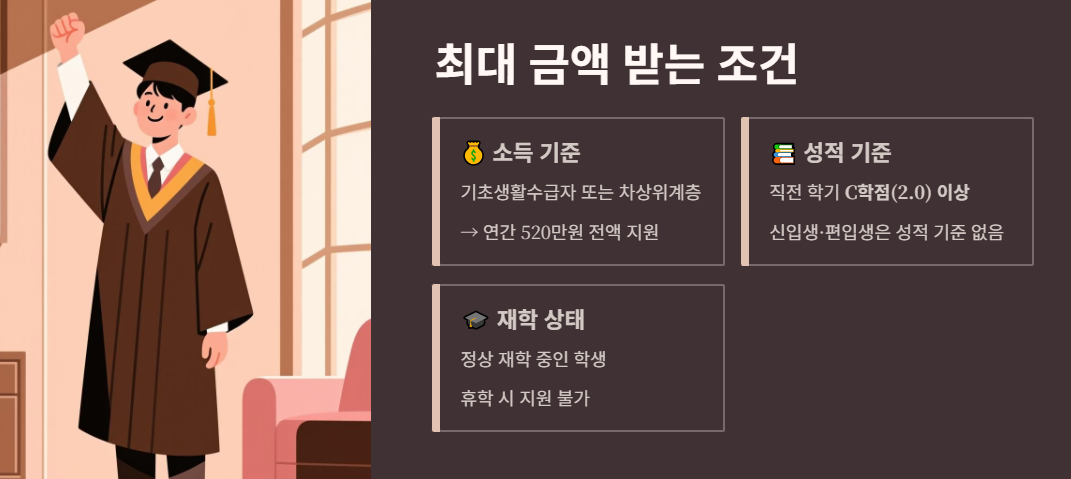 국가장학금 1유형은 소득분위에 따라 연간 260만원~520만원을 지원하며, 2유형은 대학별 자체 선발 기준으로 최대 520만원까지 가능합니다. 기초생활수급자와 차상위계층은 연간 520만원 전액 지원을 받을 수 있으며, 성적 기준은 직전 학기 C학점(2.0) 이상 또는 신입생은 제한 없습니다.