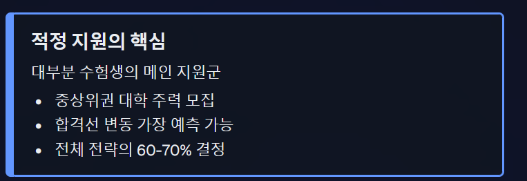 또한 나군은 수험생의 점수대와 가장 일치하기 때문에, 나군 선택이 전체 정시 전략의 60~70%를 결정하는 경우가 많습니다.