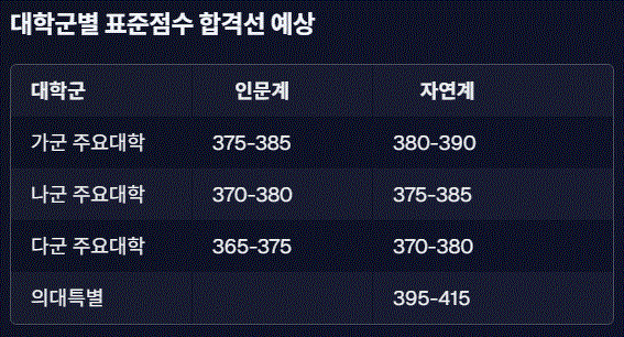 2026학년도 주요 대학군별 표준점수 합격선을 정리하였습니다. 작년대비 변동사항과 올해 예상 커트라인을 비교하여 지원전략 수립에 활용하세요.
