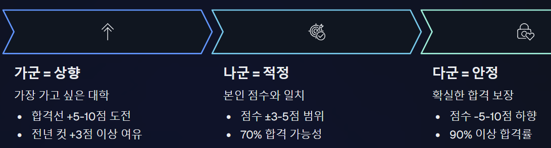 가장 가고 싶은 대학을 가군에 지원하고, 합격선보다 5-10점 높은 점수대의 대학을 선택합니다. 가군에서 과감한 도전을 하되, 전년도 커트라인보다 최소 3점 이상 여유있는 학과를 선택해야 합니다.