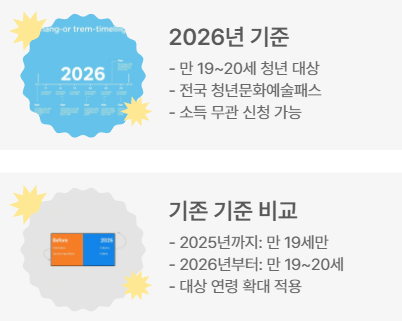 | 전국 청년문화예술패스 | 만 19~20세 | 2006년생, 2007년생 | 2006년 1월1일 ~ 2007년 12월 31일 출생자 소득 무관 신청 가능 |