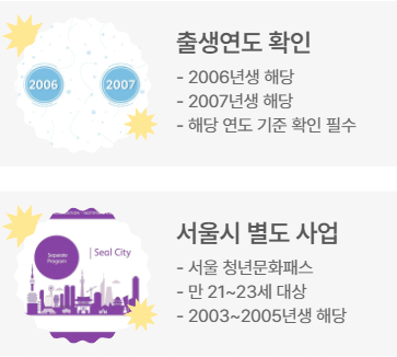 | 서울 청년문화패스 | 만 21~23세 | 2003~2005년생 | 서울시 별도 사업 |