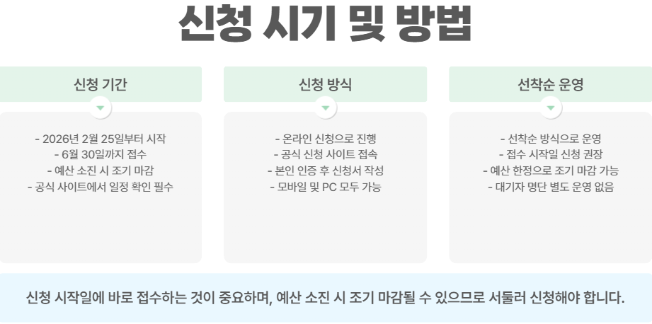 청년문화예술패스는 매년 초 신청을 받습니다. 2026년 기준 신청 기간은 2월 25일부터 6월 30일까지이며, 예산 소진 시 조기 마감될 수 있습니다. 신청은 온라인으로 간단하게 진행됩니다.