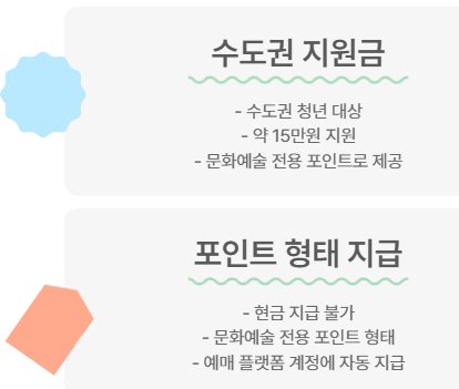 지원금은 현금이 아닌 문화예술 전용 포인트 형태로 지급됩니다. 지역에 따라 지원 금액이 다르며, 수도권보다 비수도권 지원금이 더 높은 특징이 있습니다.