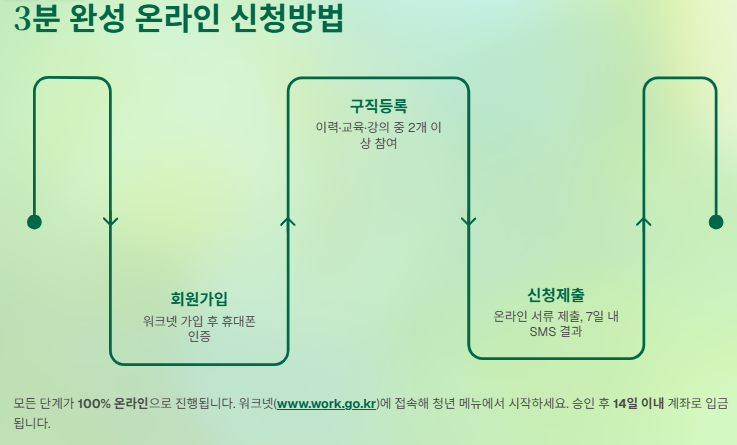 구직등록을 먼저 완료해야 지원금 신청이 가능합니다. 이력서 작성, 직업훈련, 취업특강 중 최소 2개 이상의 프로그램에 참여해야 하며, 온라인으로 진행됩니다.
