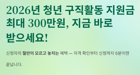 2026년 청년 구직 활동 지원금, 신청만 하면 최대 300만원 받을 수 있는데 절반이 몰라서 놓치고 있습니다. 신청자격부터 지원금액, 제출서류까지 5분이면 모든 준비 완료됩니다. 지금 바로 확인하고 혜택 받아가세요!