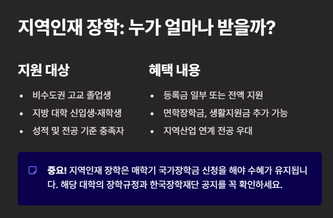 유의: '지역인재 장학'은 매학기 국가장학금(Ⅰ/Ⅱ유형 포함) 신청을 해야 수혜가 유지되는 경우가 많습니다. 해당 대학의 장학규정과 한국장학재단 공지를 꼭 확인하세요.