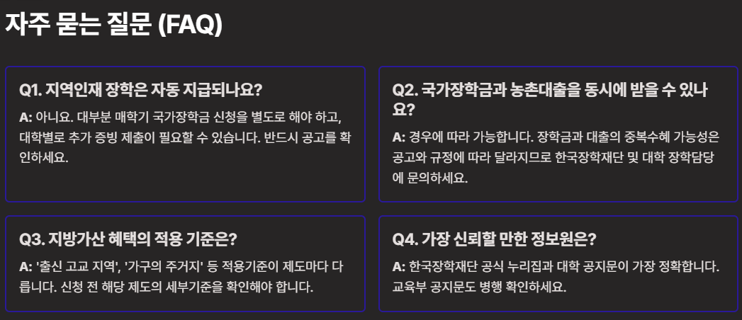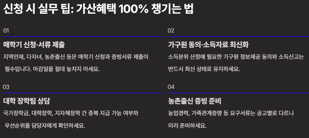 - 매학기 신청·서류 제출 여부 확인: 지역인재·다자녀·농촌출신 등은 매학기 신청과 증빙서류 제출이 필요한 경우가 많습니다. 마감일을 놓치지 마세요.
