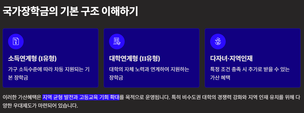 국가장학금은 소득연계형(Ⅰ유형)과 대학연계형(Ⅱ유형), 다자녀 및 지역인재 등으로 구성됩니다. 지방(비수도권) 대학의 경쟁력 강화와 지역 인재 유치를 위해 '지역인재(지방인재) 장학'과 농어촌 출신 학생을 위한 우대·대출 제도가 운영됩니다. 이러한 가산혜택은 지역 균형 발전과 고등교육 기회 확대를 목적으로 합니다.