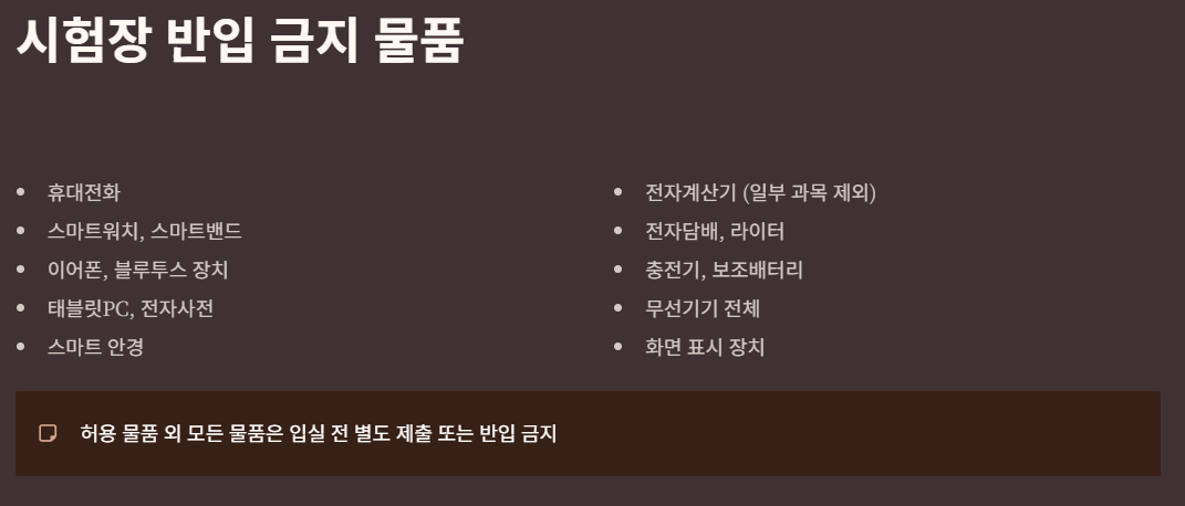 수험생 여러분은 시험장에 반입할 수 없는 물품을 반드시 확인하고 준비하시기 바랍니다. 아래 목록을 참고하세요.