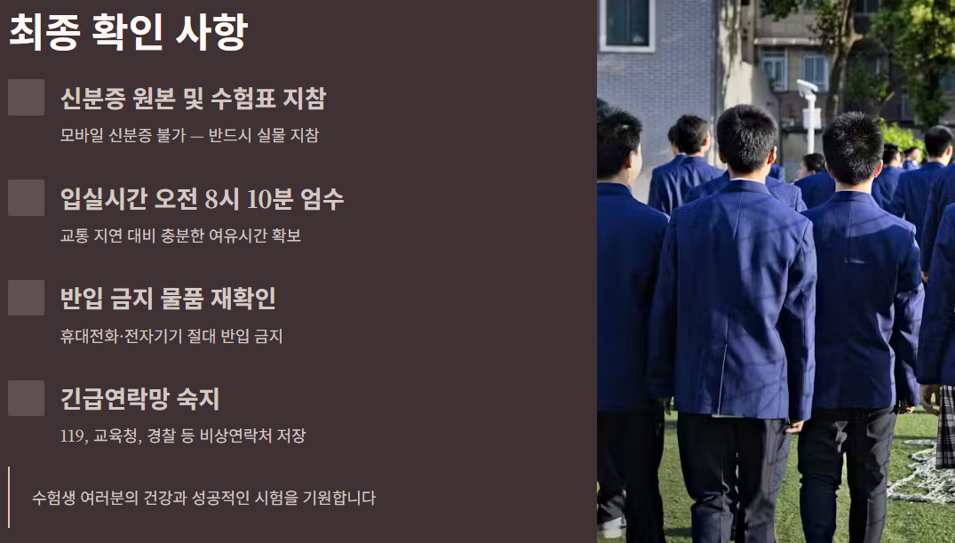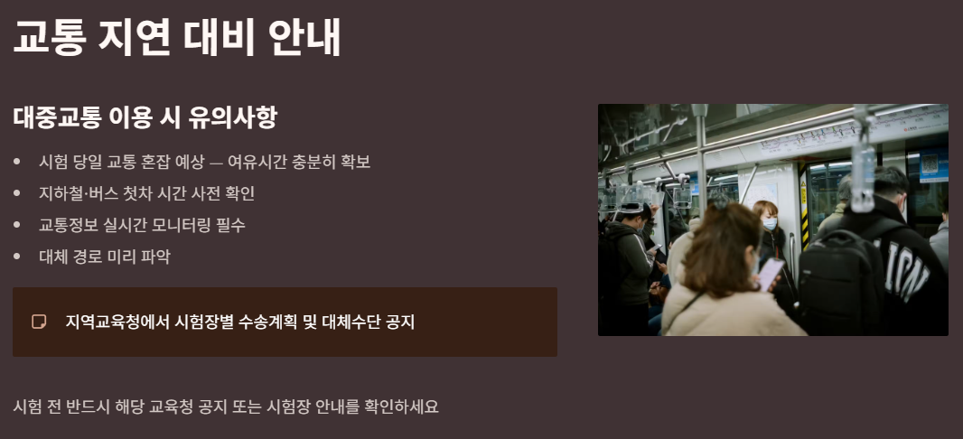 ※ 지역교육청(시·도교육청)은 시험장별 수송계획·대체수단·비상연락망을 공지합니다. 시험 전 반드시 해당 교육청 공지(또는 시험장 안내)를 확인하세요.